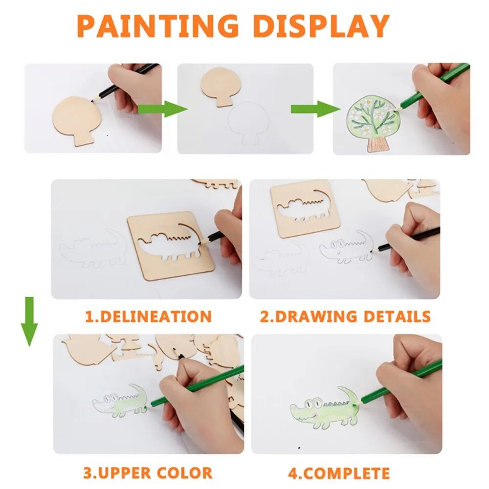 1.Utilice esta herramienta de arte de plantilla de pintura de madera para crear patrones encantadores.Incluso los niños pueden crear un hermoso arte.Está diseñado para manos pequeñas y es fácil de transportar y usar.