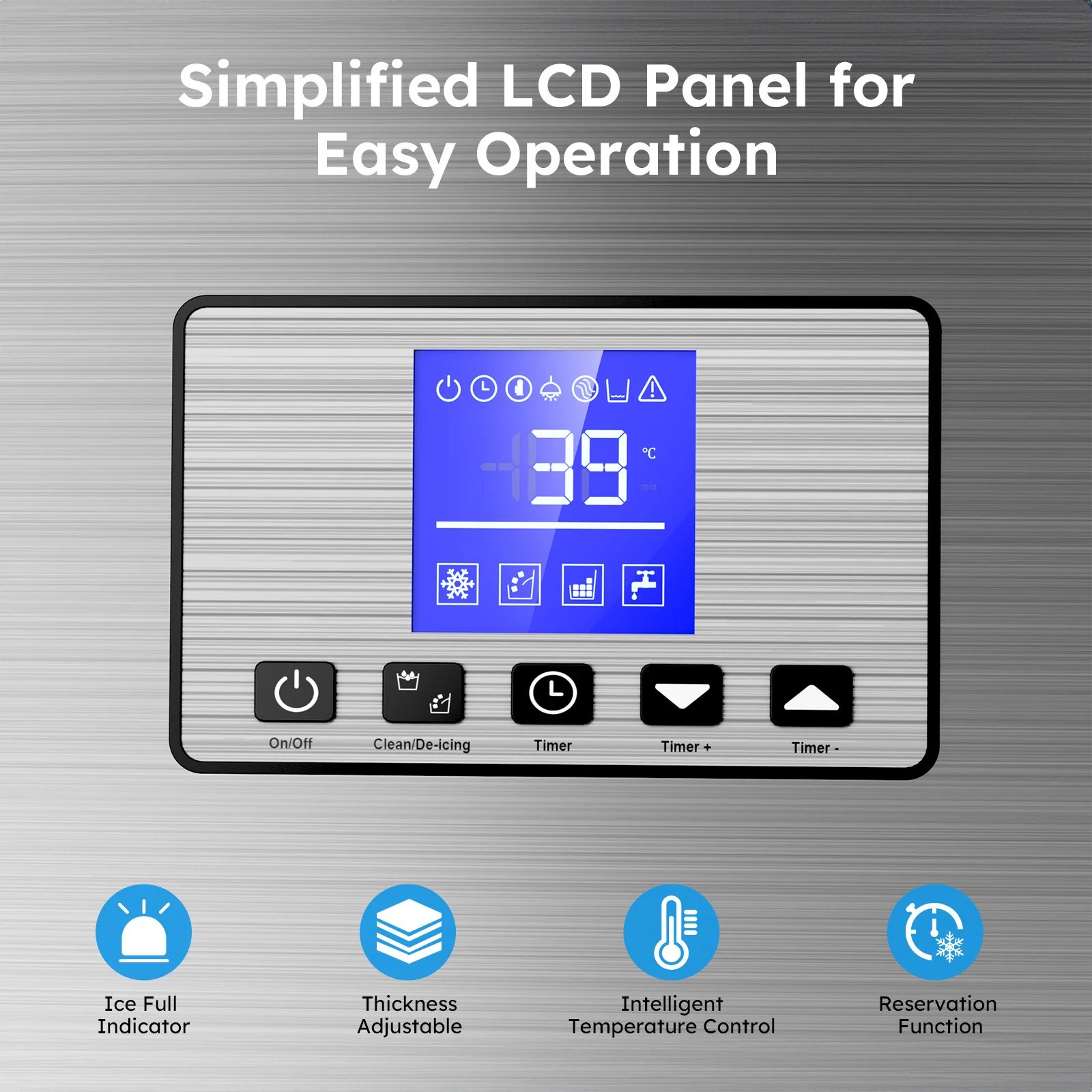 Panel LCD inteligente: puede preestablecer y monitorear el proceso de fabricación de hielo fácilmente.El grosor de los cubitos de hielo se puede ajustar aumentando o disminuyendo el tiempo de fabricación de hielo.Los rayos azules y la función de limpieza automática facilitan la observación de la bandeja de hielo y garantizan la higiene de la bandeja de hielo.