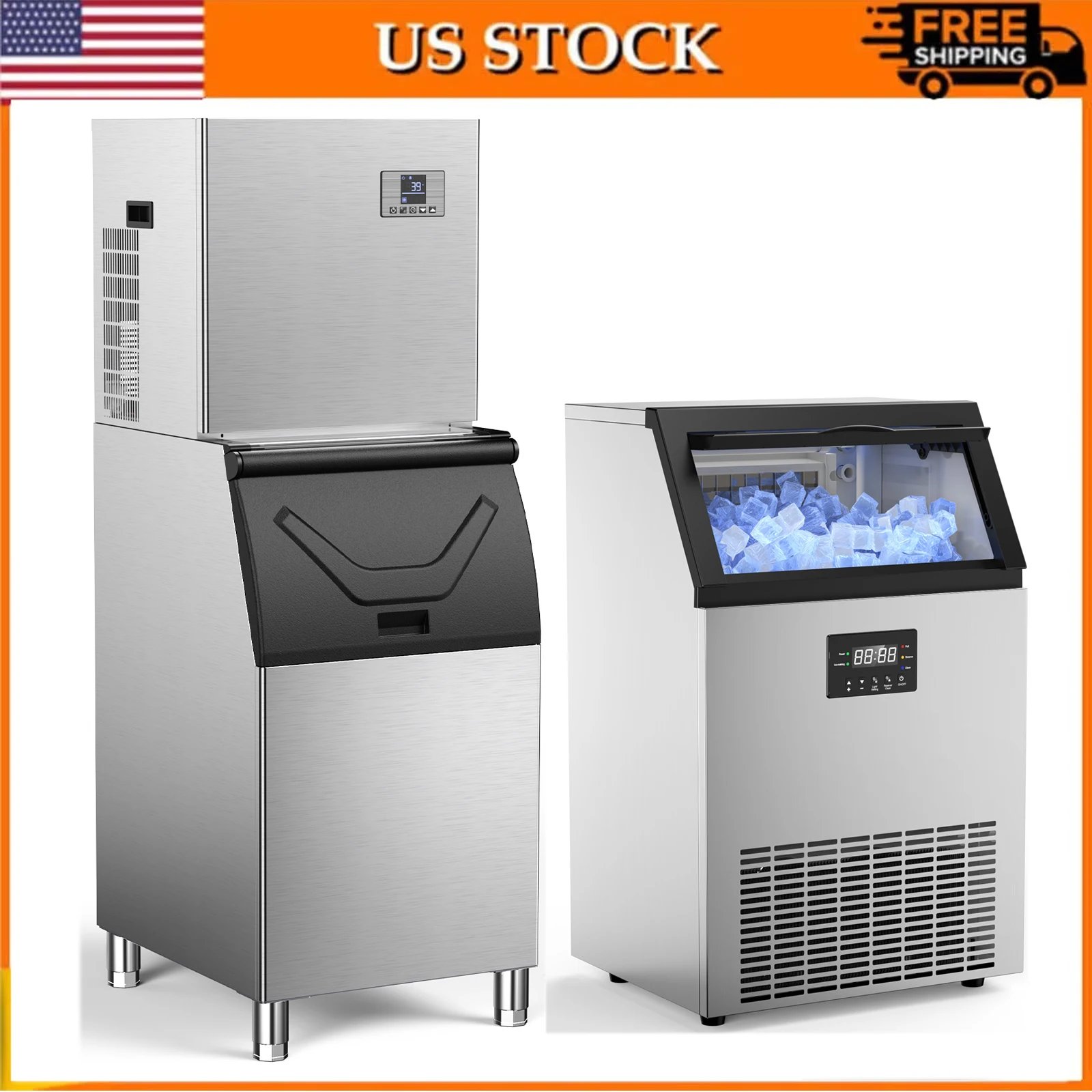 Máquina de hielo comercial, máquina para hacer hielo con contenedor de almacenamiento grande, máquina de hielo autolimpiante automática, perfecta para bares en casa y negocios, acero inoxidable